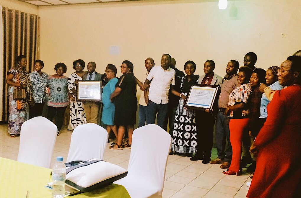 Abakozi bari bitabiriye bafatana ifoto n'aba Bayobozi bombi mu rwego rwo kwishimira igikorwa